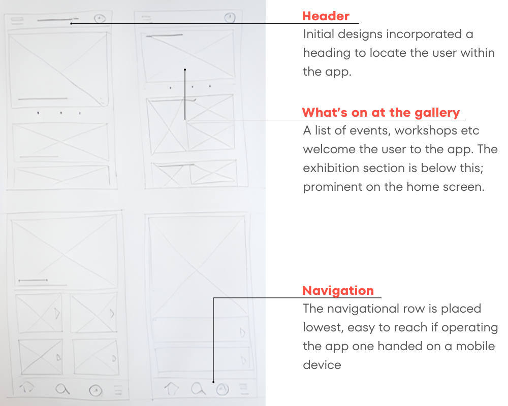 Wireframing proved a useful tool for quickly generating layout ideas and formats. For the landing screen, the design intent was to welcome the user to the gallery and show them the extent of events, exhibitions and workshops that the foundation had to offer.