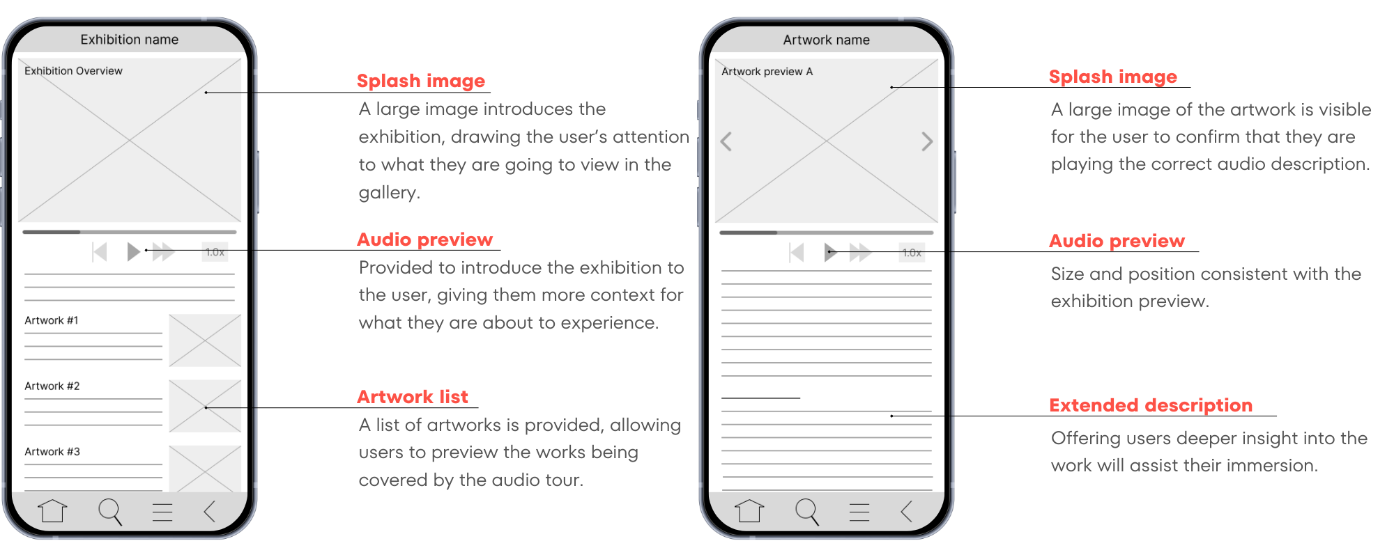 The low fidelity prototype was updated following two rounds of user testing. The approach to the design of the homepage moved towards a simpler and more clear user flow along the “happy path”: encouraging the user to choose an exhibition, listen to the associated audio description, and then proceed to the audio tour of the artworks.