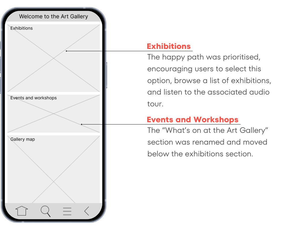 Through the design process, early designs were revised to include negative space between the image sections. This minimises visual clutter and allows the images to breathe better. The text descriptions also assist to guide users through the app more effectively.