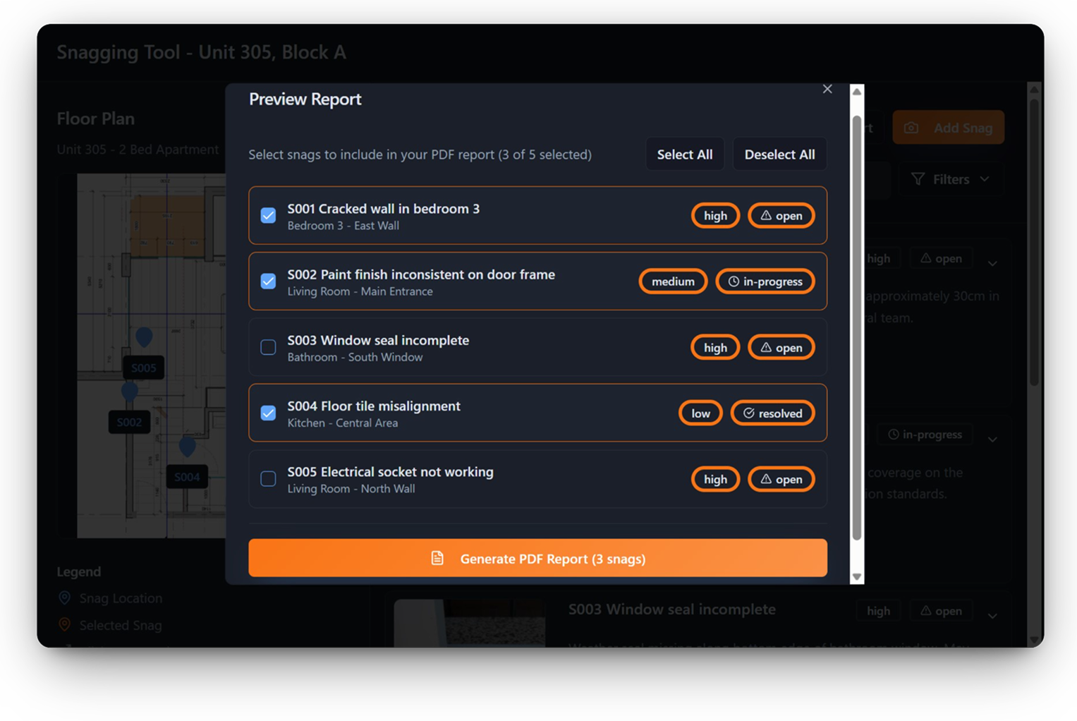 Users wanted to customise reports, such as creating reports of only “high” priority snags. I created a report preview page to select snags for reports.