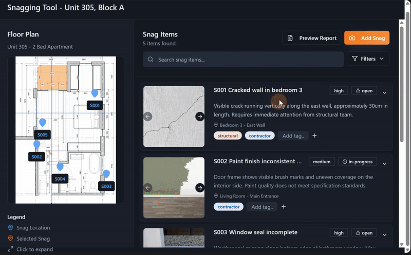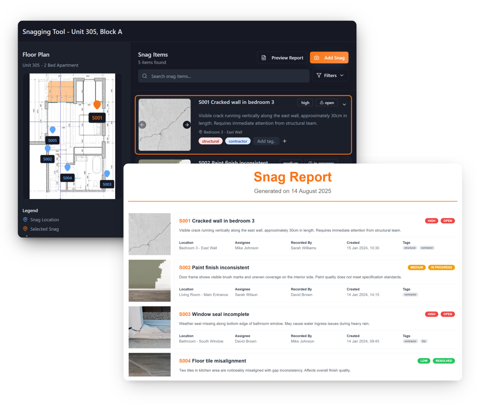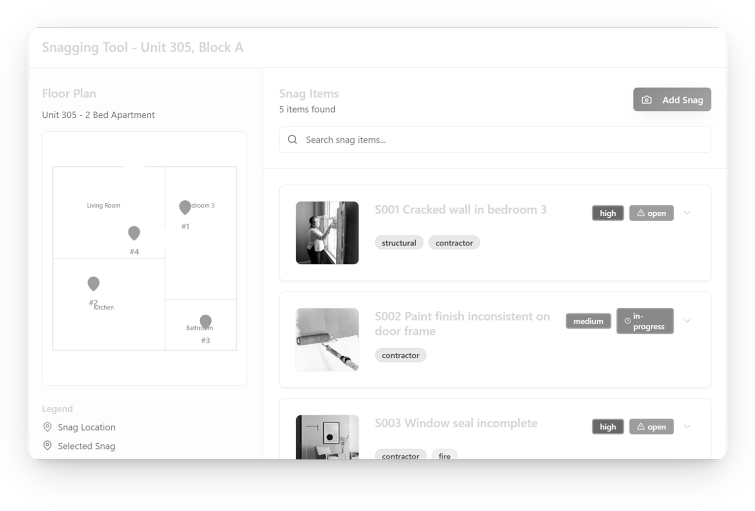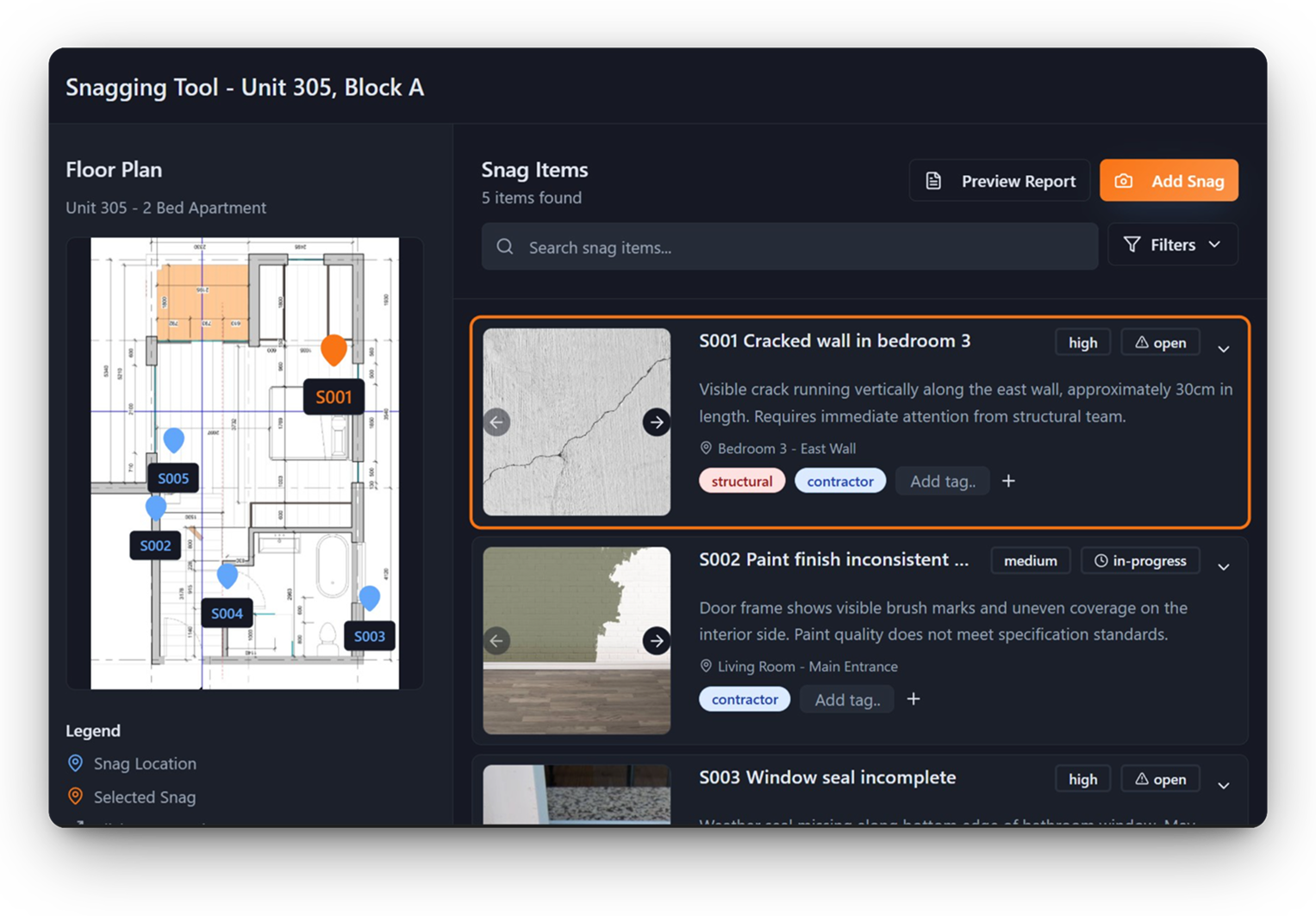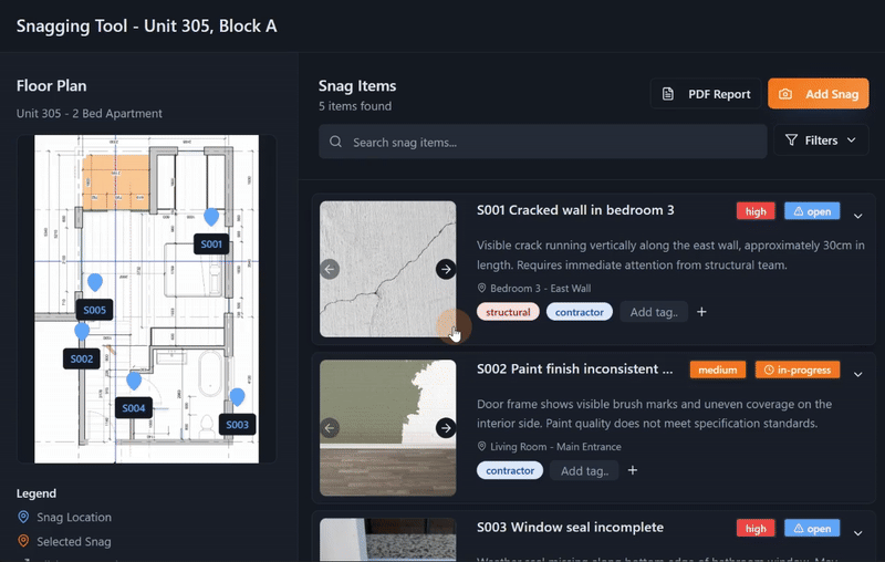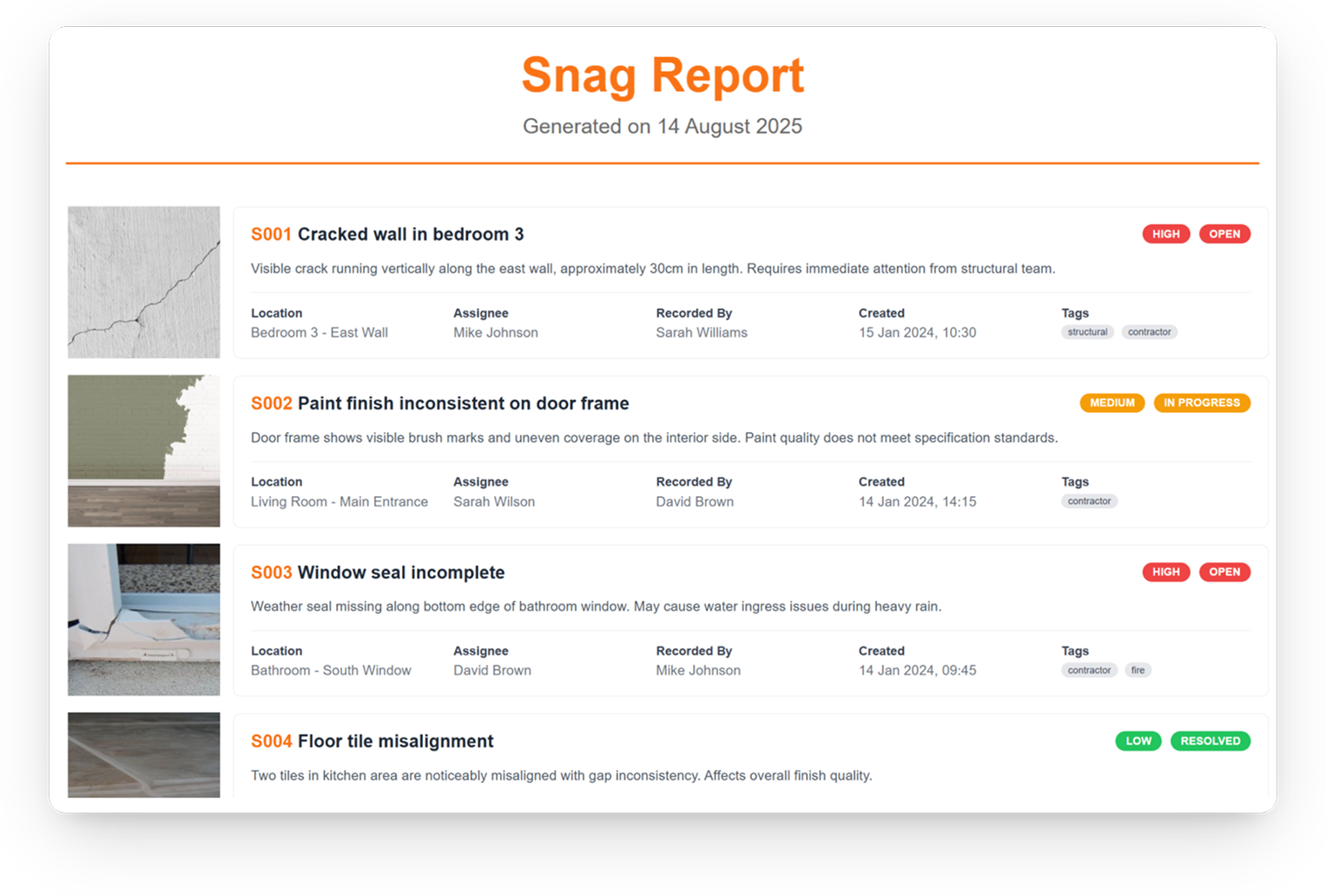 Prioritisation & Status: Note snag priority level and current status (ongoing, etc).