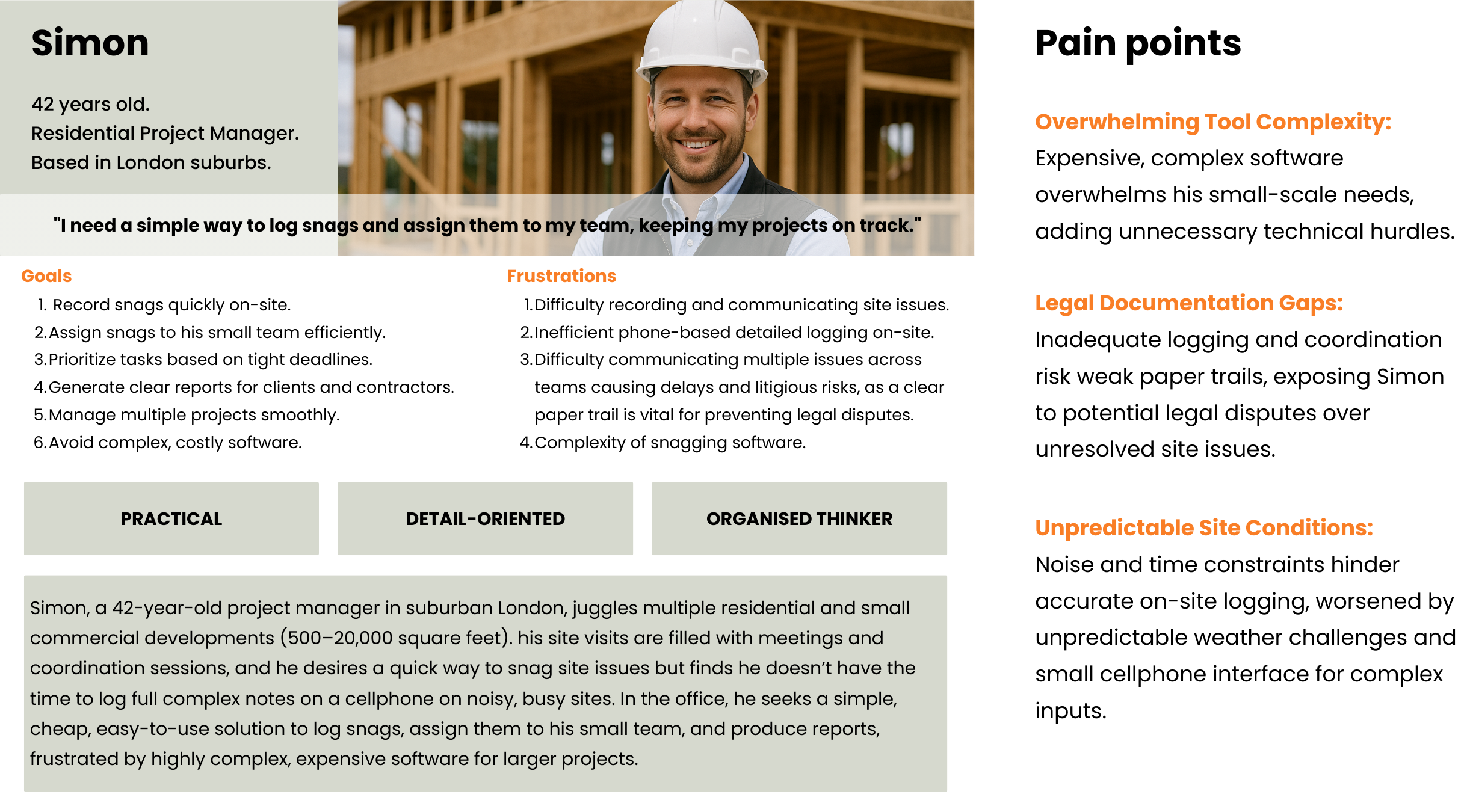 Problem Statement: Simon needs a cheap, easy-to-use solution to log detailed site snags and generate reports for his teams.